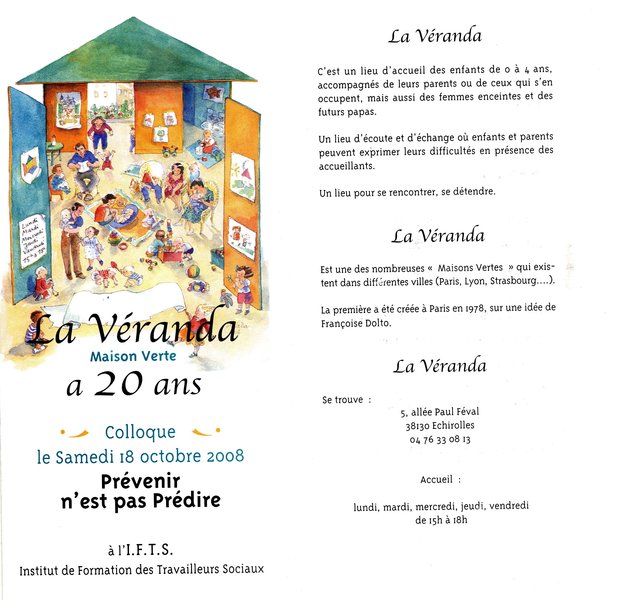 La Véranda, maison verte à Echirolles fête ses 20 ans et organise à cette occasion un colloque dont le titre est :" Prévenir n’est pas prédire" F.Dolto a crée en 1979 la première Maison Verte à Paris avec une équipe de professionnels, psychologues, psychanalystes, éducateurs pour "venir avant" le symptôme, disant : le psychanalyste arrive toujours trop tard !" c’était donc un projet de prévention de la pathologie de l’enfant. Aujourd’hui, on parle de prévention à travers des repérages de comportements déviants chez le tout petit qui augurerait de troubles chez l’adulte en devenir ; il ne s’agit donc plus de prévenir mais de prédire le devenir de ces jeunes . C’est autour de ce débat que se déroulera notre journée.