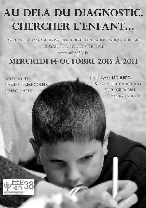 Cette conférence est organisée par l’AFPEN 38 au lycée Emmanuel Mounier Grenoble. Les intervenants sont Marie Thérèse Colpin (Thérapeute familiale au CERAS) et Bruno Harlé (pédopsychiatre, Unité d’hospitalisation d’enfants, centre hospitalier Le Vinatier de Bron)